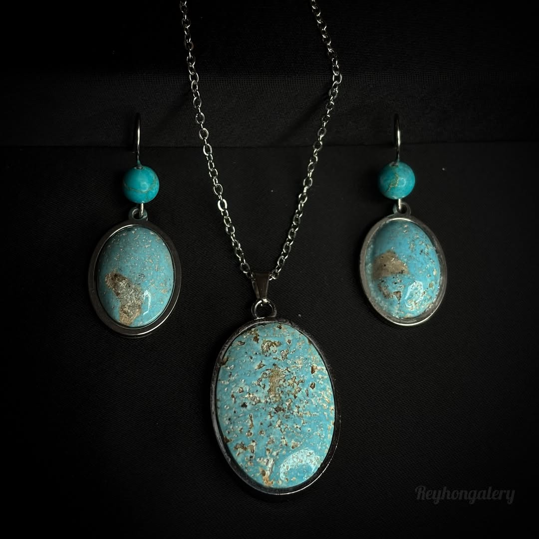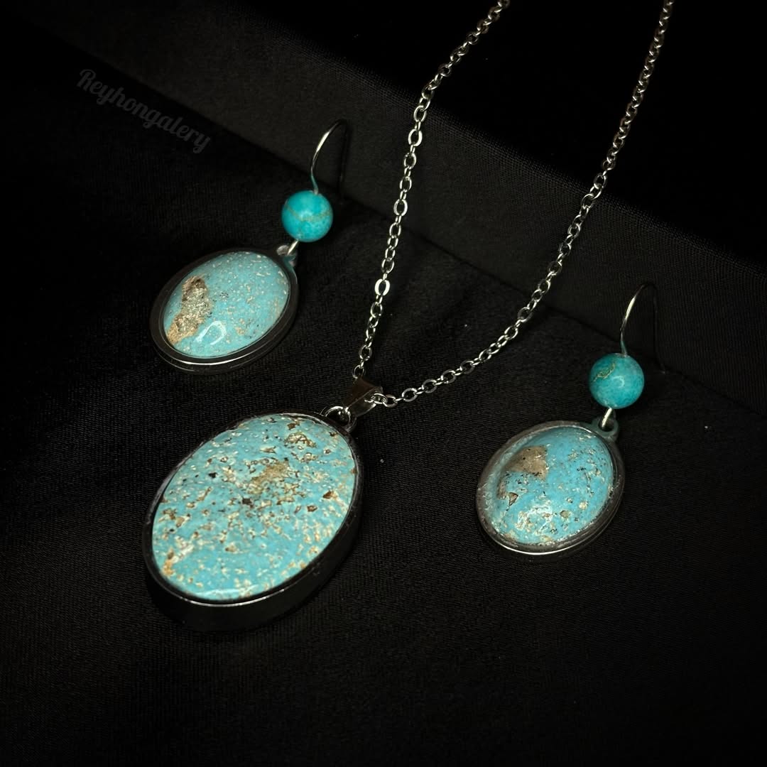 گردنبند و گوشواره فیروزه کرمان با رکاب و زنجیر استیل ضدحساسیت