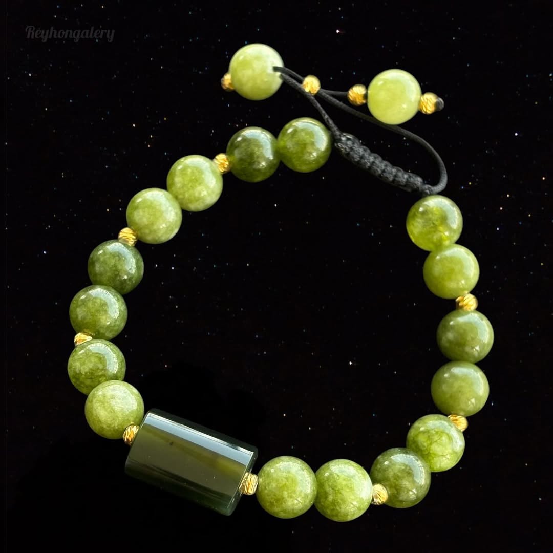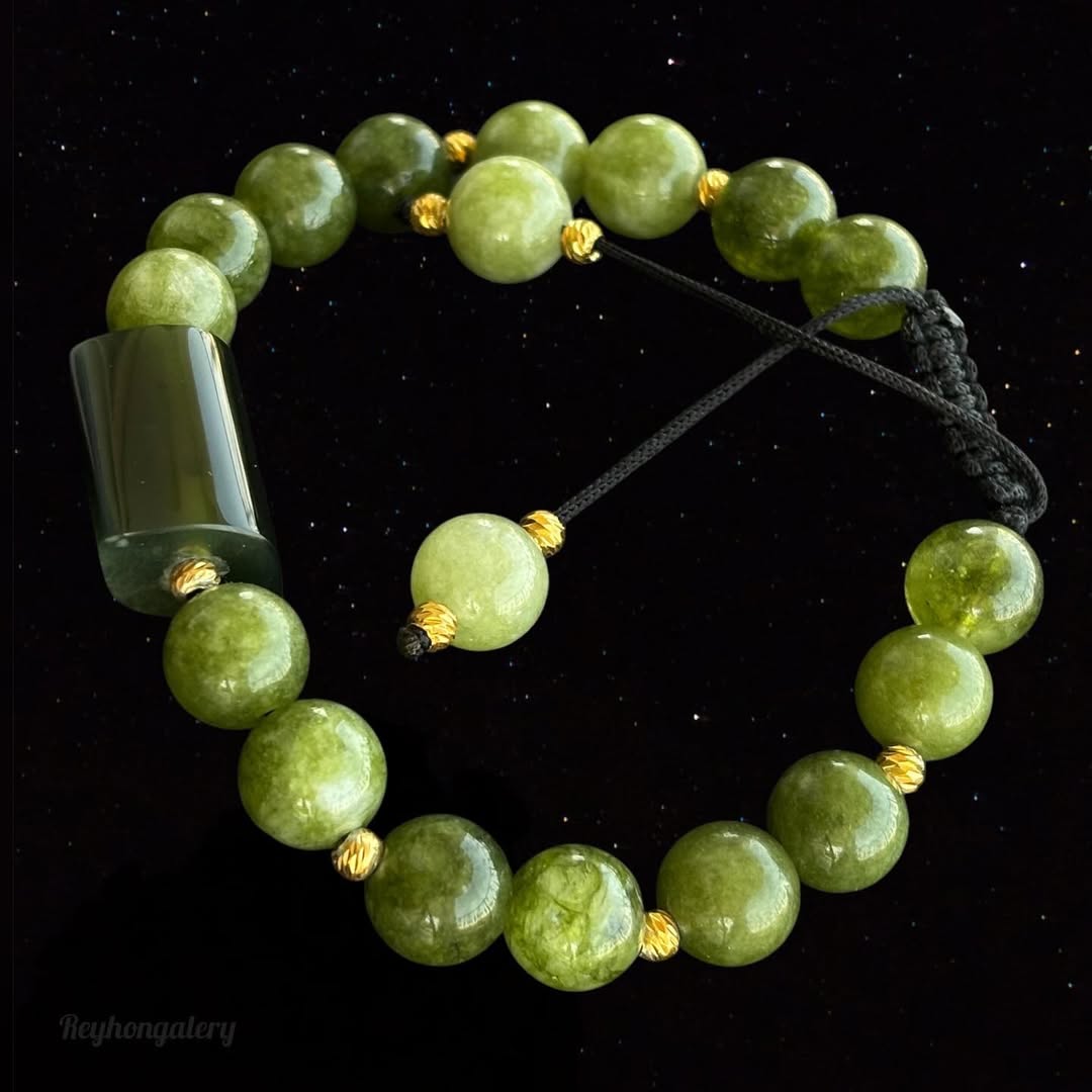 دستبند یشم با سنگ طبیعی با ترکیب گوی نقره، طرح البرنادو با روکش طلا و بند کشویی. این سنگ به ثبات شخصیتی و خود شکوفایی کمک می کند و برای دست یابی به موفقیت و رفاه موثر است.
