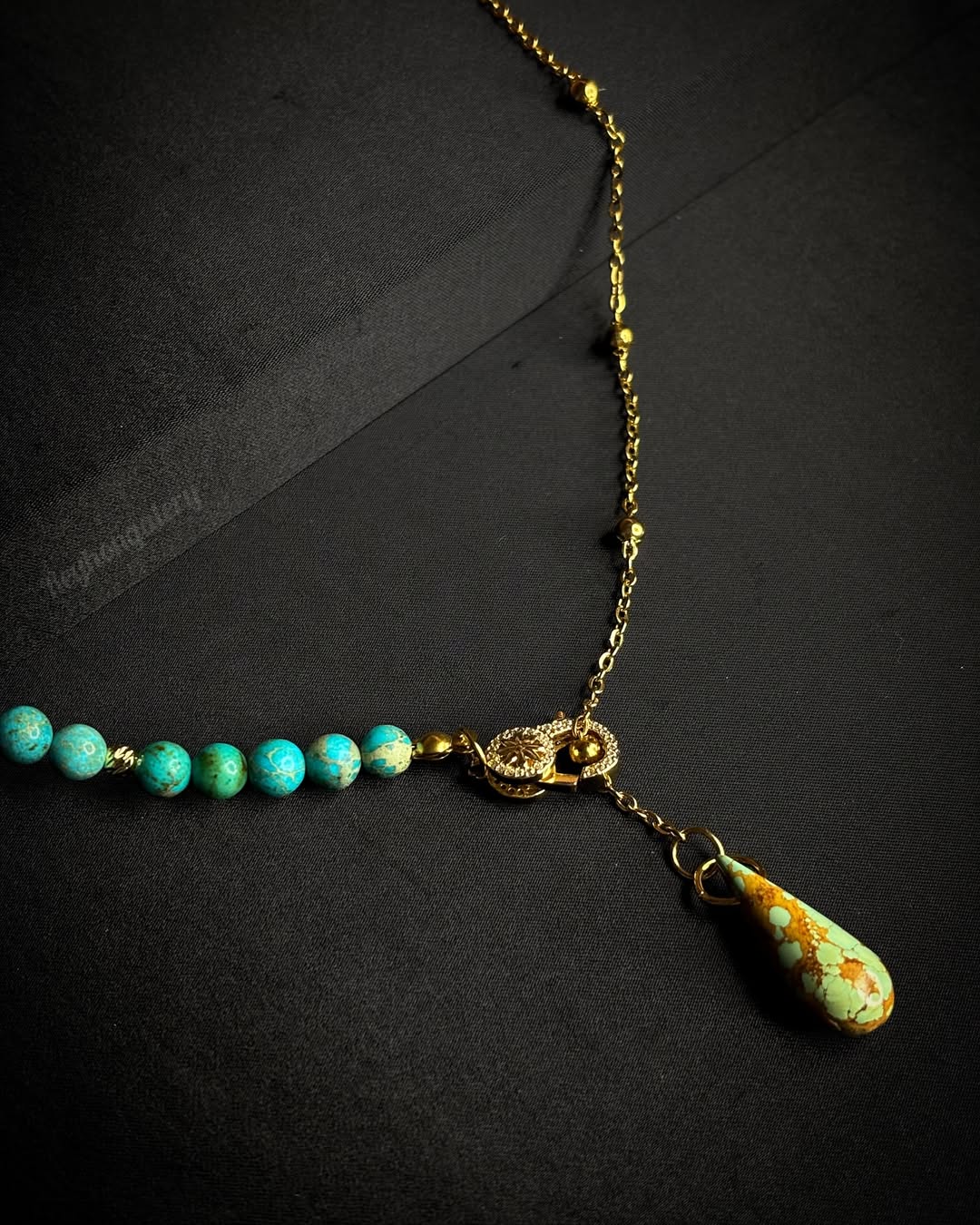 گردنبند فیروزه با آویز رگه طلایی فیروزه نیشابور و زنجیر استیل رنگ ثابت و قفل سوارسکی ترکیب آبیِ آرامبخش فیروزه با درخشش استیل… یه انتخاب همیشهزیبا! خواص فیروزه: آرامشبخش، افزایش انرژی مثبت، جذب خوششانسی و دور کردن حسهای منفی.
