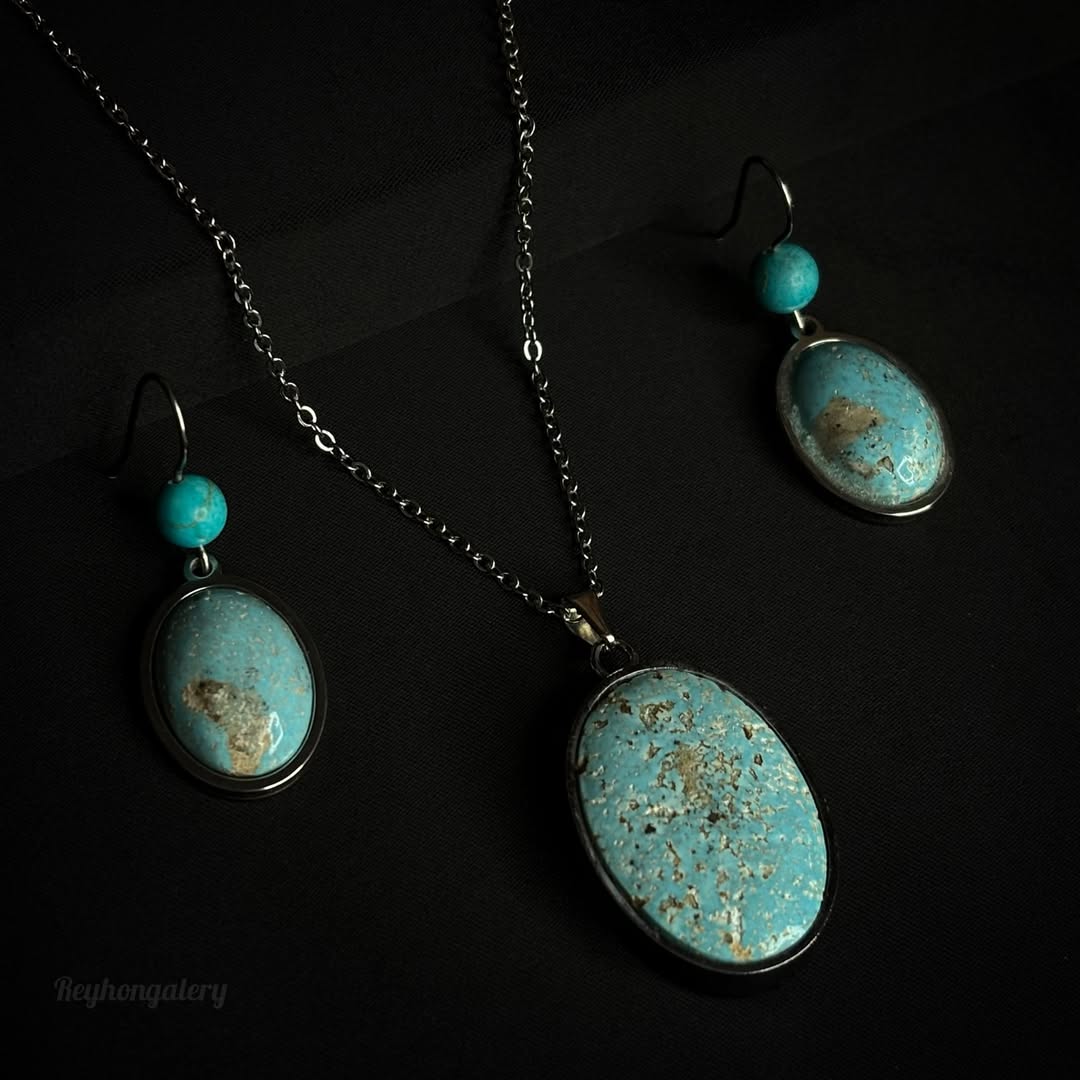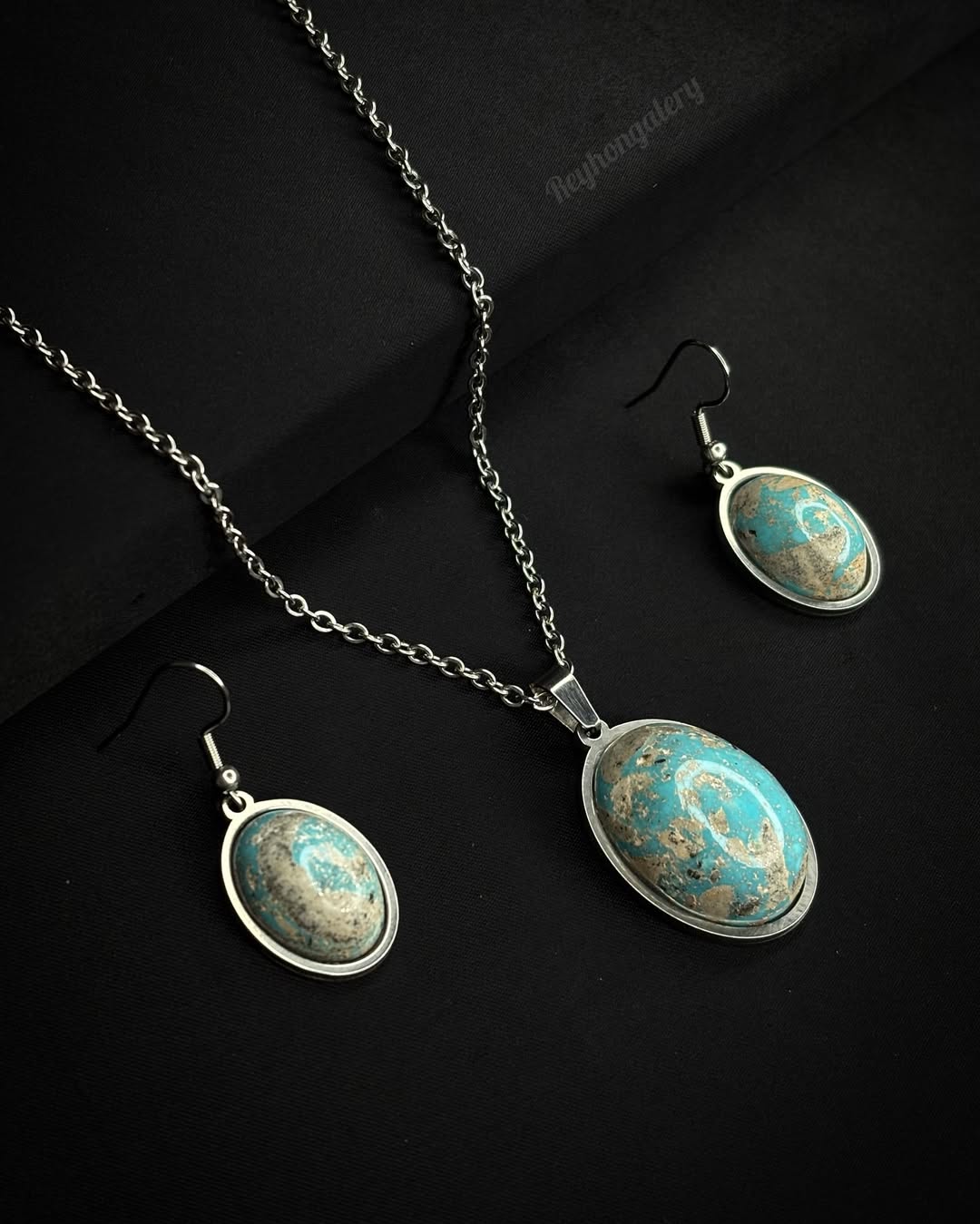 گردنبند و گوشواره فیروزه کرمان با رکاب و زنجیر استیل ضدحساسیت